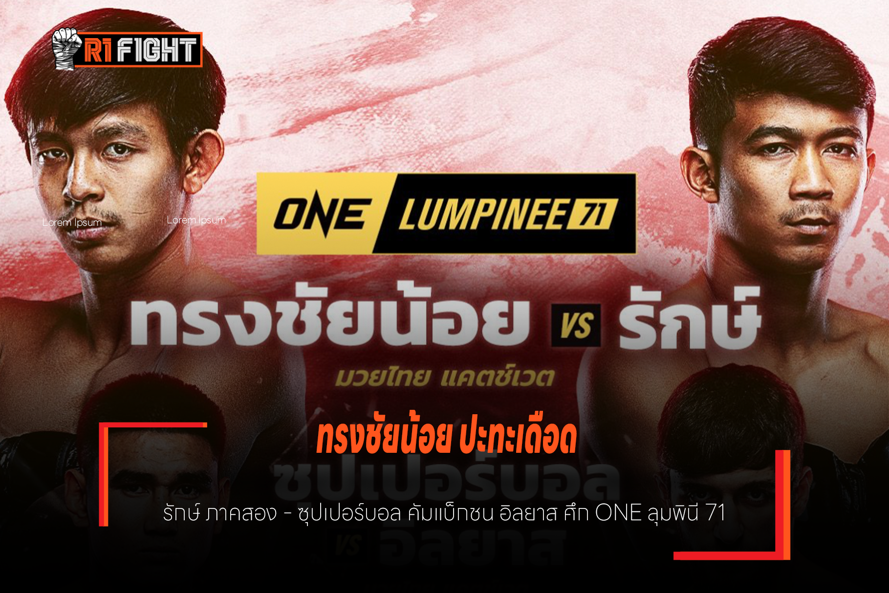 งานนี้การันตีความเดือดไม่แพ้ครั้งไหน ๆ สำหรับ ศึก ONE ลุมพินี 71 ที่จะจัดขึ้นในวันศุกร์ที่ 19 ก.ค.นี้ ที่ล่าสุดได้เผยโฉม 2 คู่ชูโรงประจำรายการออกมาเป็นที่เรียบร้อย โดยคู่เอกนำรายการเป็นการรีแมตช์ระหว่าง “ทรงชัยน้อย เกียรติทรงฤทธิ์” พบกับ “รักษ์ เอราวัณ” ในกติกามวยไทย พิกัดเฉพาะ (แคตช์เวต) 116 ป. และคู่เอกภาคอินเตอร์ “ซุปเปอร์บอล วันของโอม MBK” กลับมาโชว์ฝีมืออีกครั้ง พบกับ “อิลยาส มูซาเอฟ” จอมแกร่งจากรัสเซีย ในกติกามวยไทย พิกัดเฉพาะ (แคตช์เวต) 142 ป.